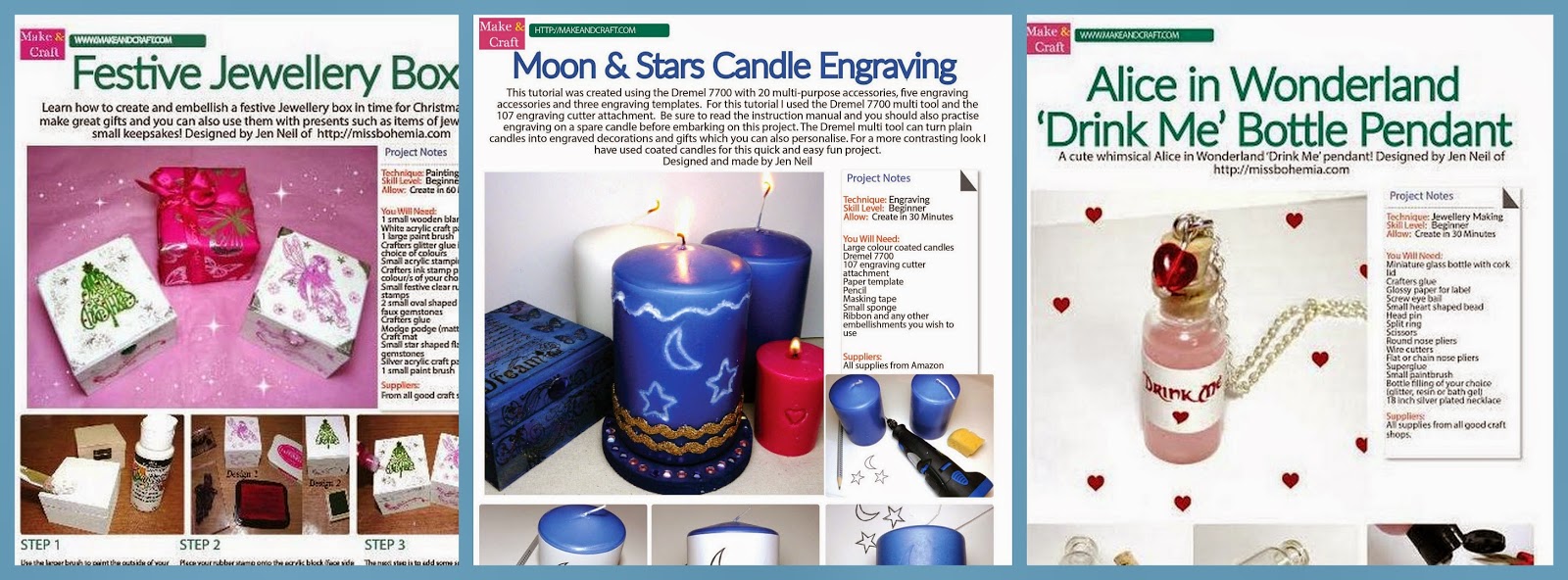 I've also had tutorials featured in Make and Craft Magazine over the year. This was both exciting and a great way to keep me creative while working behind the scenes and Miss Bohemia! Tutorials included Christmas keepsake boxes, Alice 'Drink Me' Pendants and candle carvings! This fab magazine has lots of crafty tutorials, news and features!