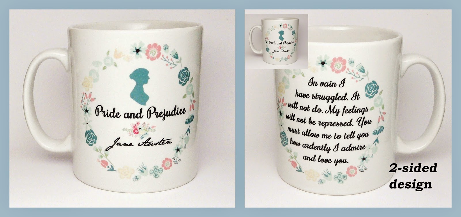If you can't wait, here's a sneak peek at one of my new Jane Austen mugs, which will form part of a new floral theme collection. I'm currently offering 10% off this mug and everything else at Miss Bohemia!